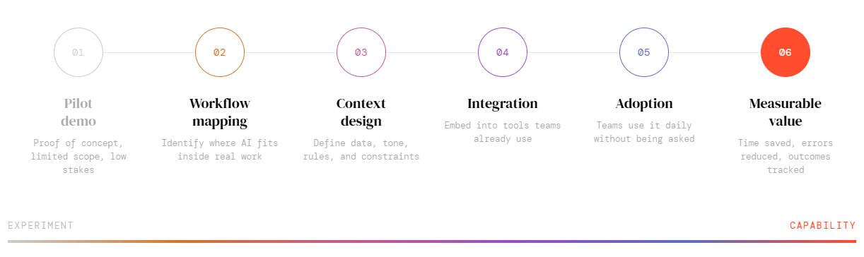 When organisations begin with the tool instead of the workflow, with the demo instead of the operating reality, or with broad ambition instead of specific pressure points, the result is often predictable: low adoption, weak integration, and unclear value.