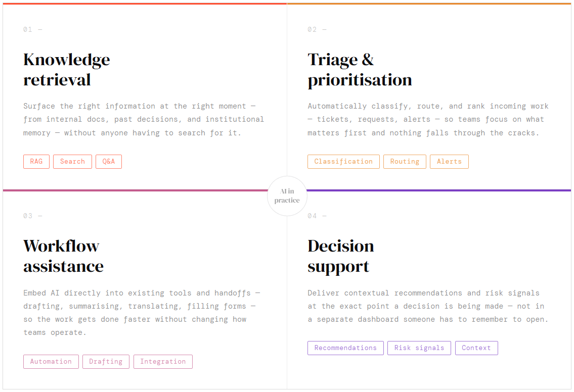 One strong starting point is intelligent knowledge retrieval. In many organisations, people lose significant time searching for previous work, internal guidance, historical decisions, templates, client context, or sector-specific expertise. A well-designed AI-supported knowledge layer can make that information easier to find and reuse, but only if it reflects the way the organisation categorises and understands its own work.